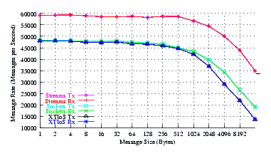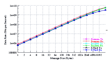 Figure 4 plots the measured performance of Sockets compared to XTI over Socket and XTI approaches. STREAMS demonstrates significant improvements at message sizes of less than 1024 bytes.