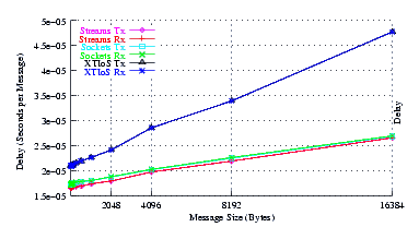Figure 5 plots the average message delay of UDP Sockets compared to XTI over Socket and XTI approaches. STREAMS demonstrates significant improvements at message sizes of less than 1024 bytes.